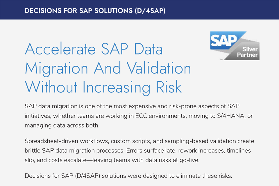 Manual, spreadsheet-driven SAP data migration increases risk, cost, and uncertainty—especially as data volumes grow. Sampling-based validation and custom scripts often mask issues until late in the project, driving rework and delays. Decisions for SAP automates and governs SAP data migration and validation to improve accuracy, reduce dependency on specialized resources, and give teams confidence in their data before go-live.
